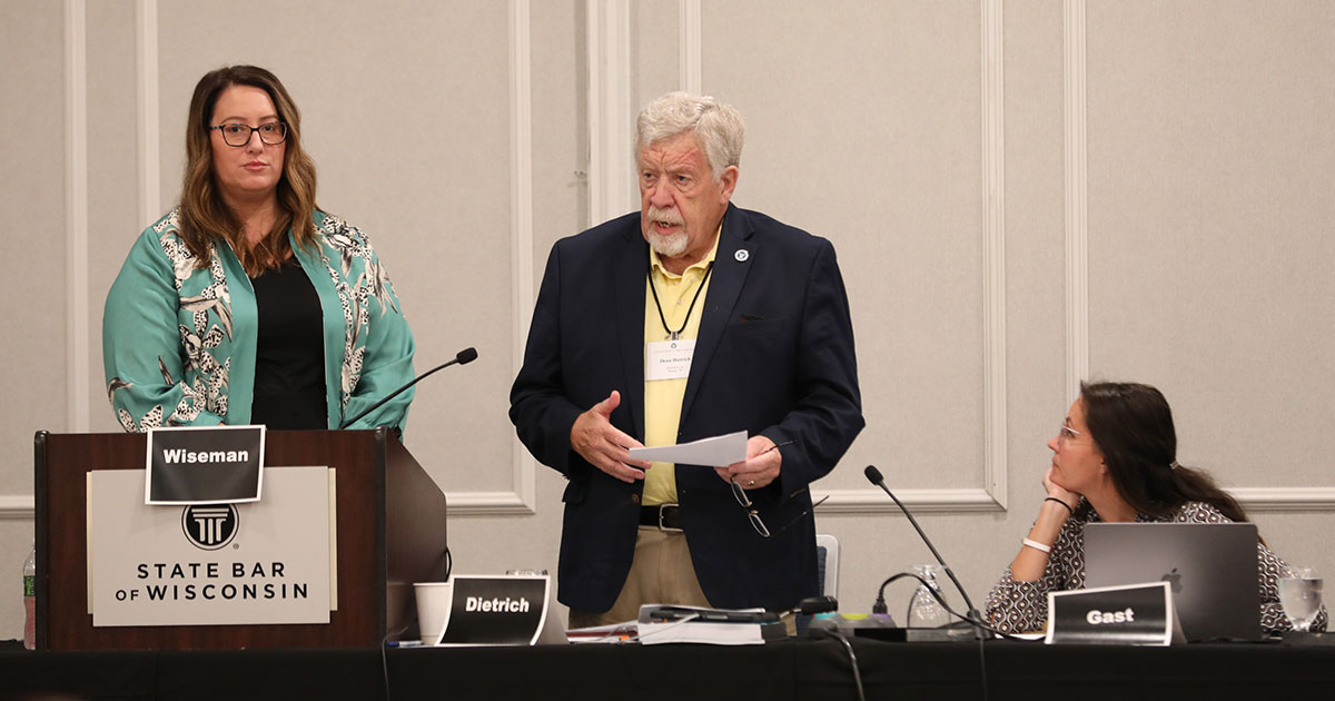 Photo from September 2024 State Bar of Wisconsin Board of Governors meeting. From left: Chairperson Melodie Wiseman, Past-president Dean Dietrich, and Secretary Martina Rae Gast.